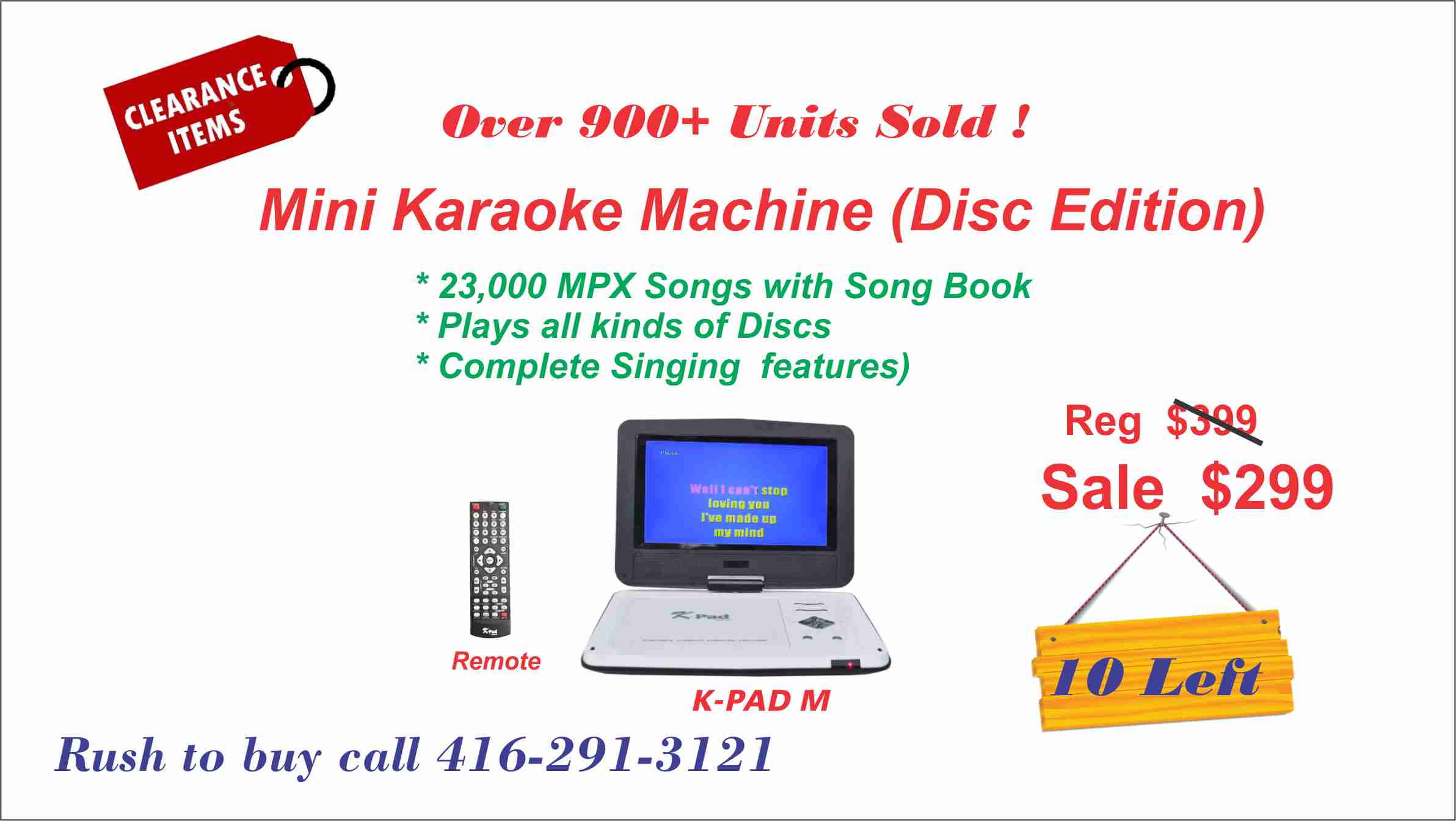 It is designed with a special Midi Disc recorded with 6534 English Songs, 2322 Philippine Songs, 1026 Gospel Songs, 54 Christmas Songs and 108 Children Songs, total 10044 songs. You can search the song by the song No. in a song book provided, with a Remote Control. A 9” LCD Monitor is integrated in this machine. You can also connect it to a larger screen and to a more powerful Amp/Speaker.
