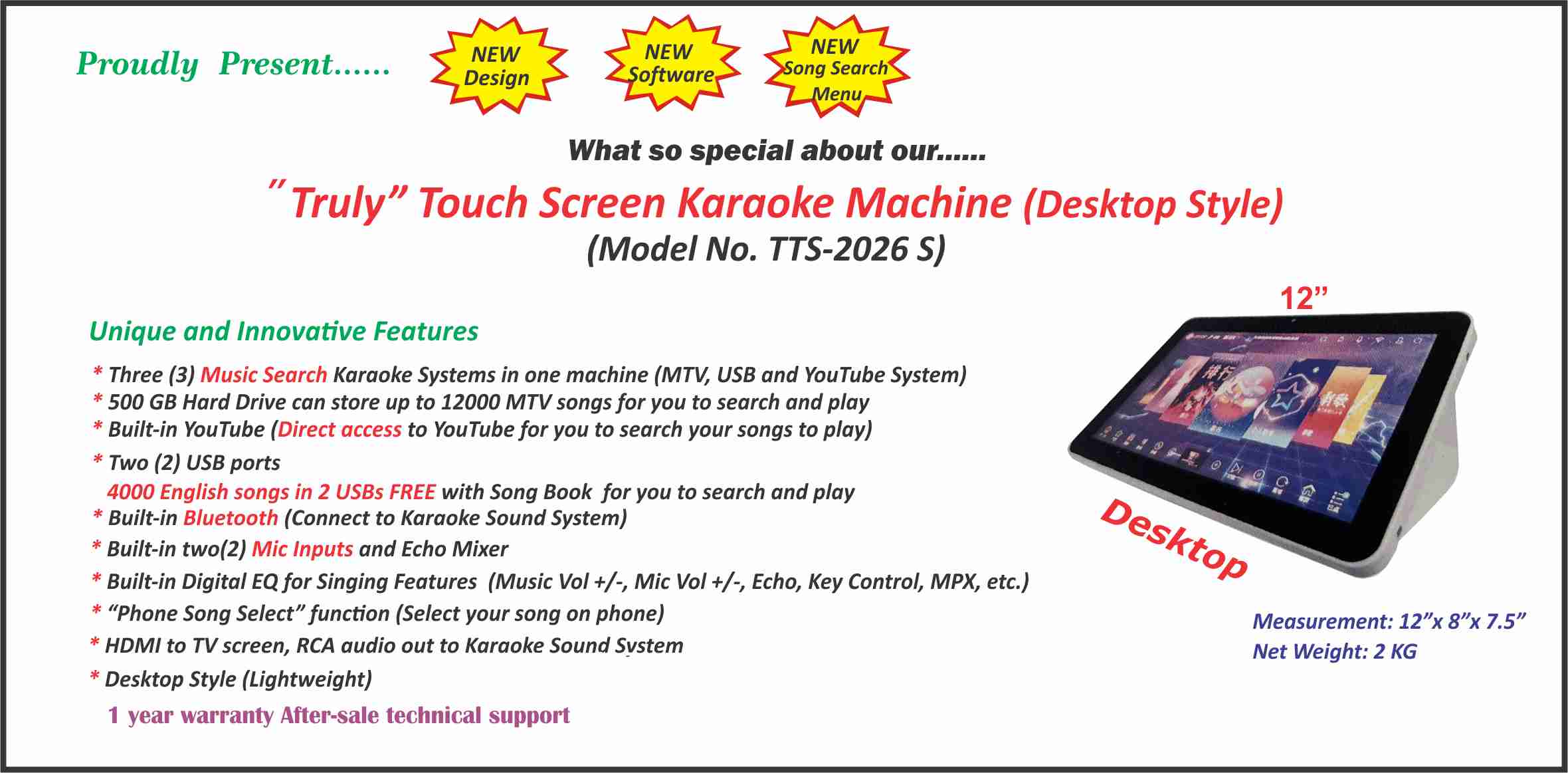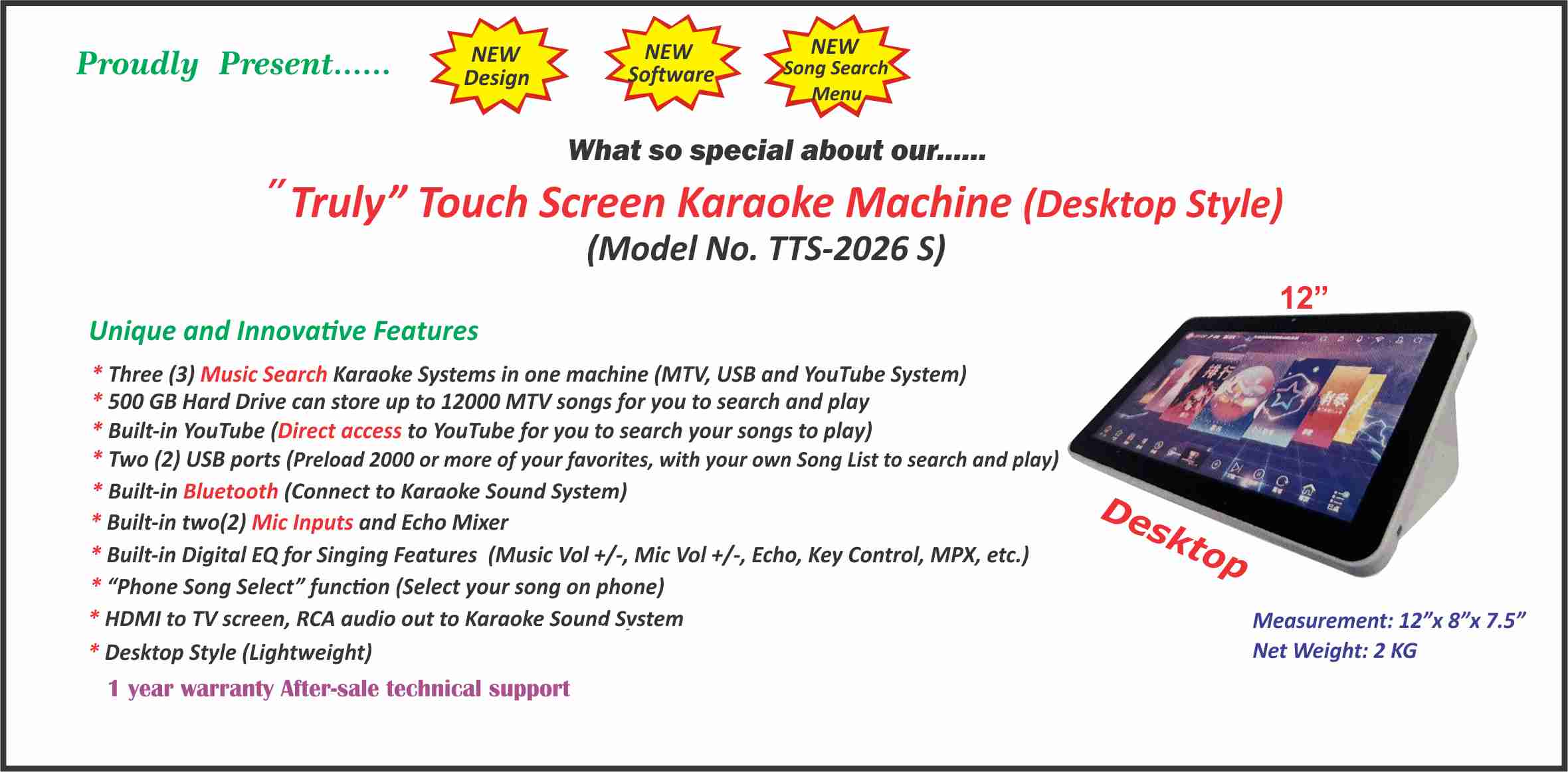 it is the Best and “Truly” Touch Screen Karaoke Machine (Model No. TTS-2026) !!