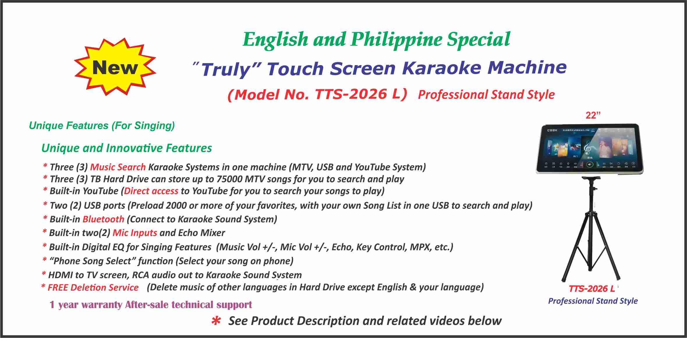 it is the Best and “Truly” Touch Screen Karaoke Machine (Model No. TTS-2026) !!